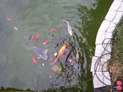 Derzeit bewohnen 14 Japan Koi, 5 Goldfische und 1 Sterlett den Teich.