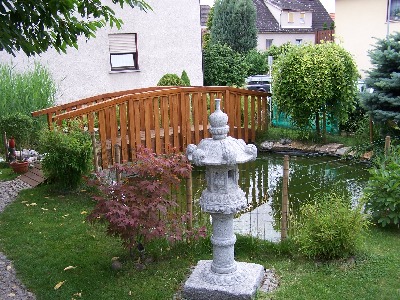 Ein wichiger und vor allem kostenspieliger Teil des Teichs ist die Gestaltung. Wie man in diesem Bild sieht wurde die Gestaltung leicht im Japanischen Stile mit Geisterhäuschen, gebogenem Gartenweg und Rundbrücke gehalten.